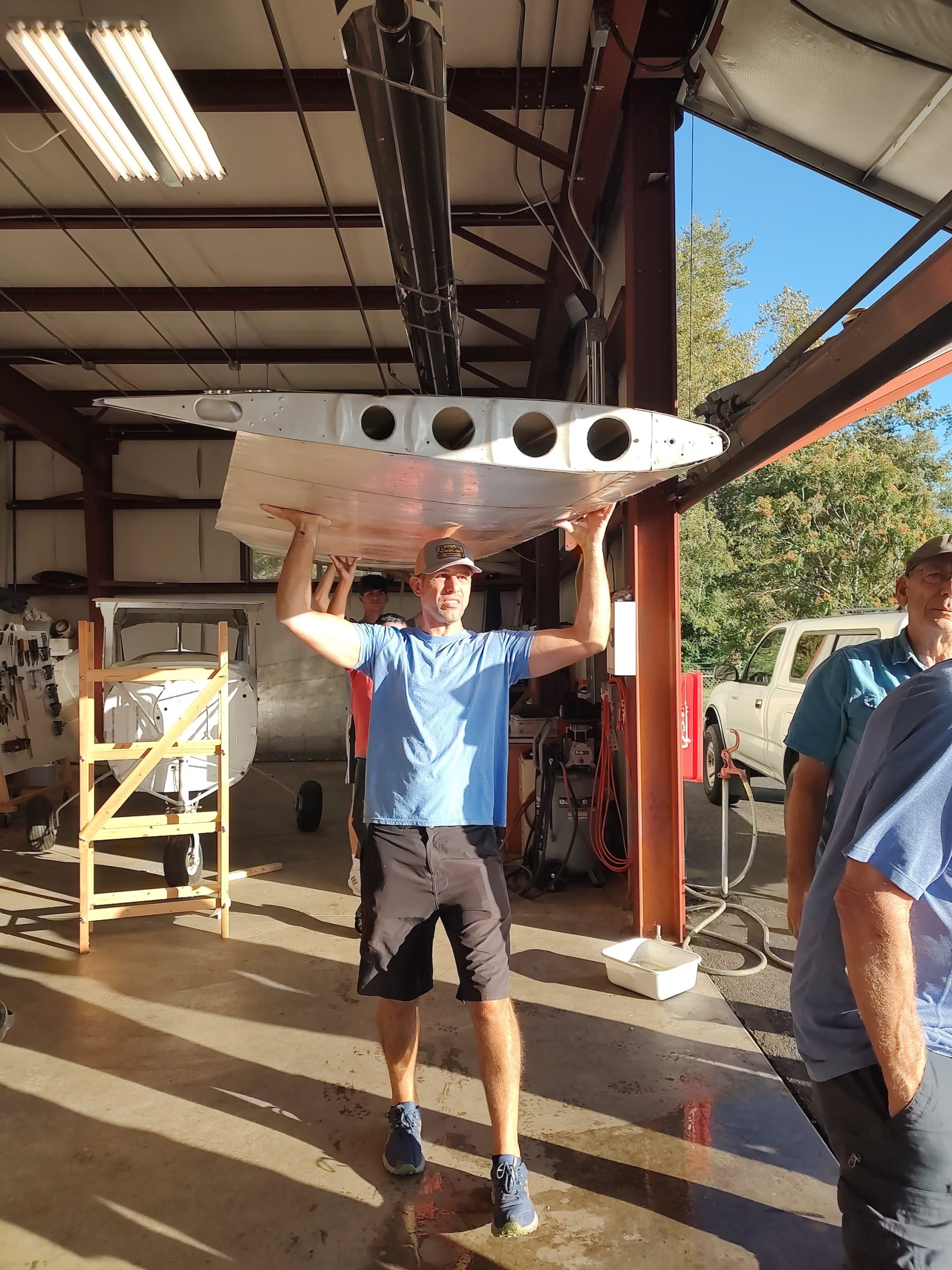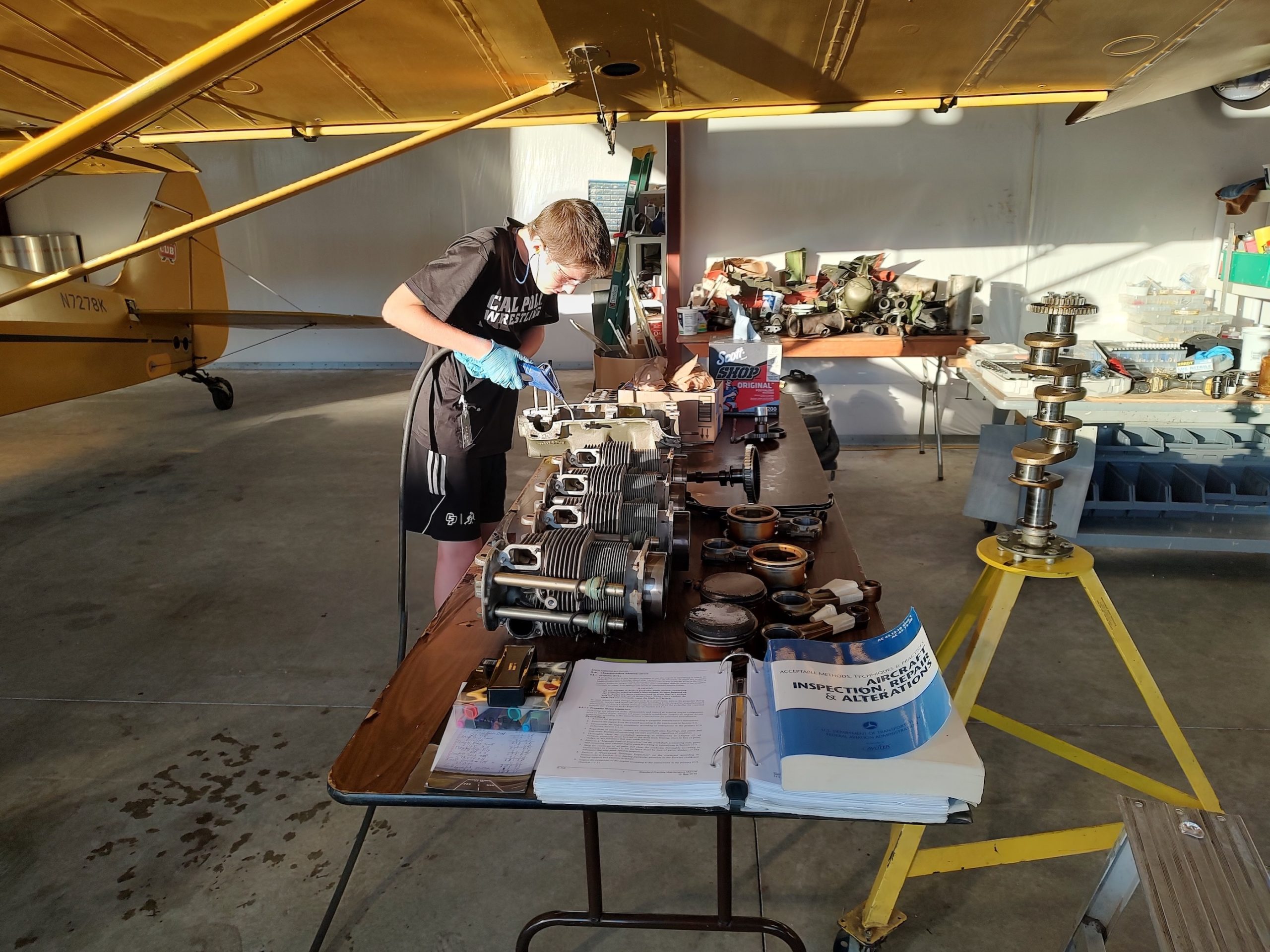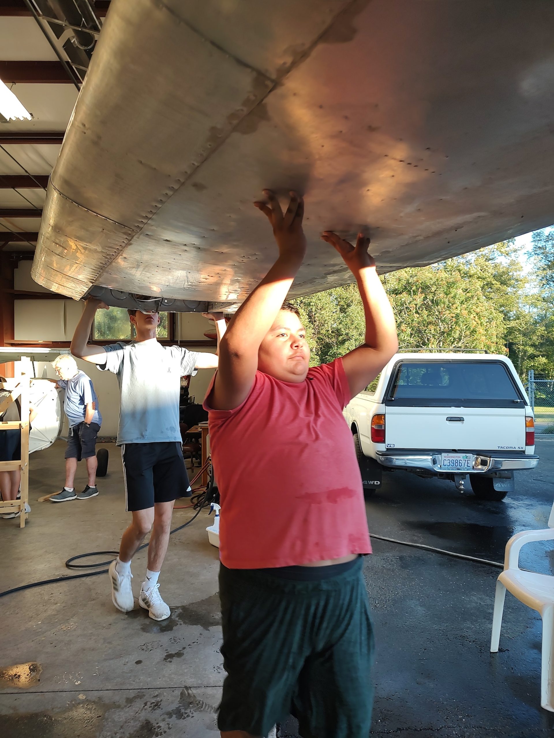 Participants, parents and mentors separated into groups of interest. The wings were pulled out of storage in the hangar and cleaned. The engine crankcase was scrubbed and sprayed with a dye penetrant to check for cracks. Work continued on the battery box.