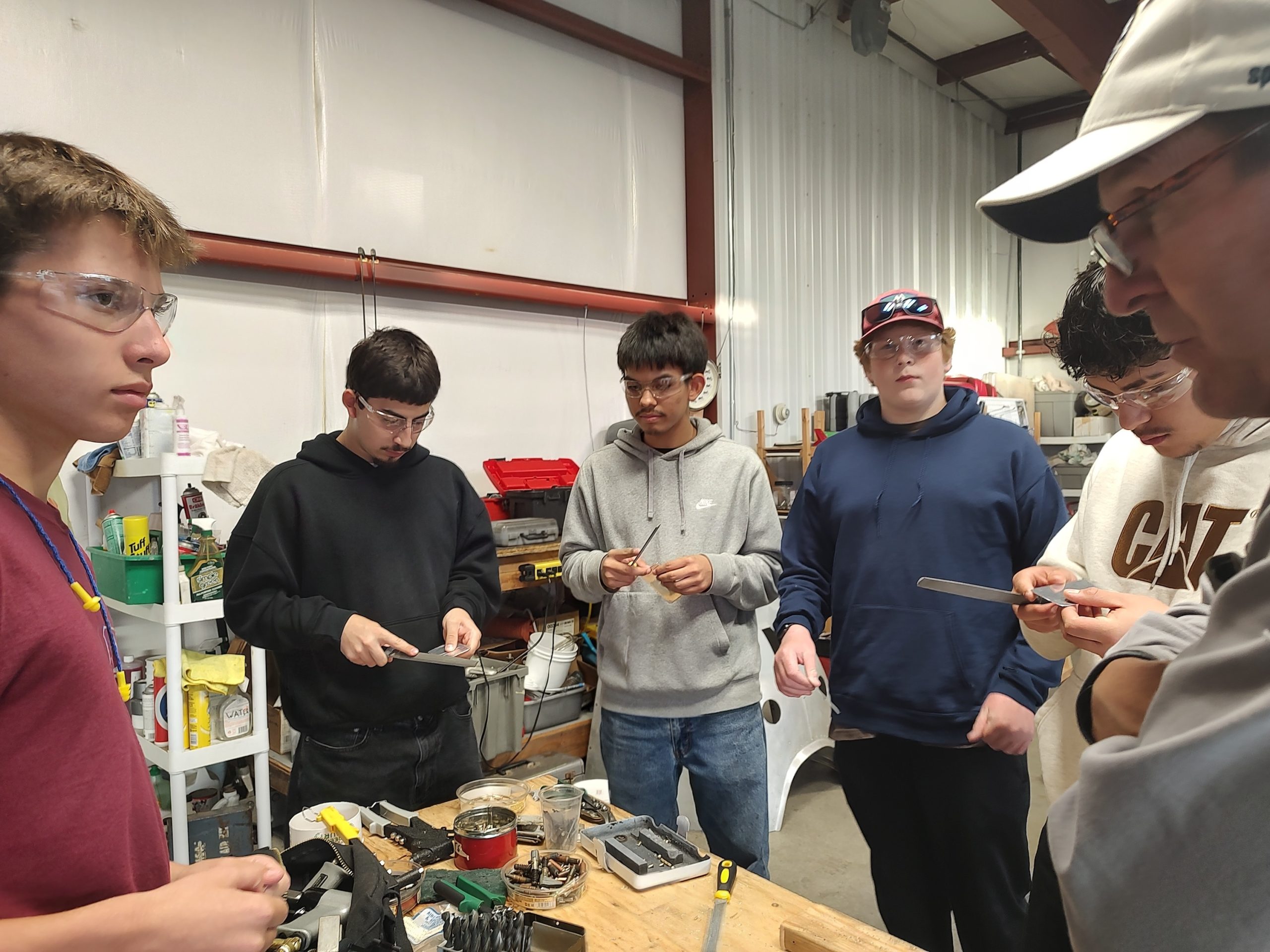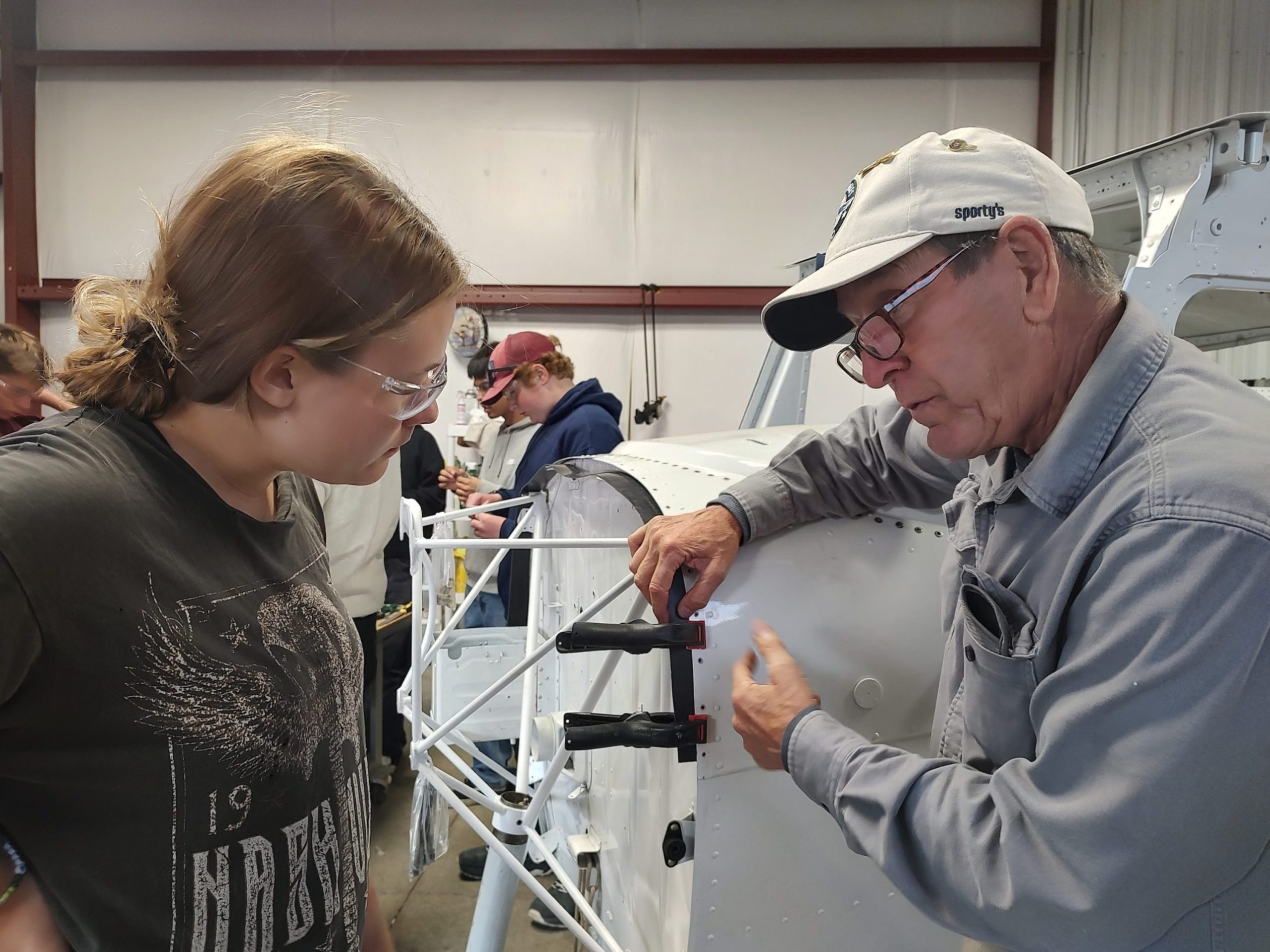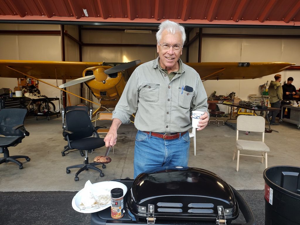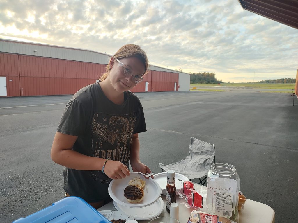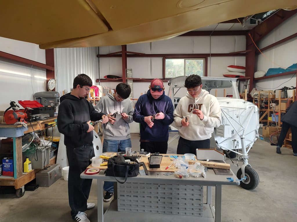 We were greeted by Mark Burns who had barbequed a delicious meal of hamburgers, portabella mushrooms, beans and salad, and drinks for all to enjoy. Four new participants joined us and were led by Nathan (youth participant) to create their badges. Penelope completed the riveting for the seal for the cowling. Carter and Jay (mentor) checked for the quality of the rudder system.