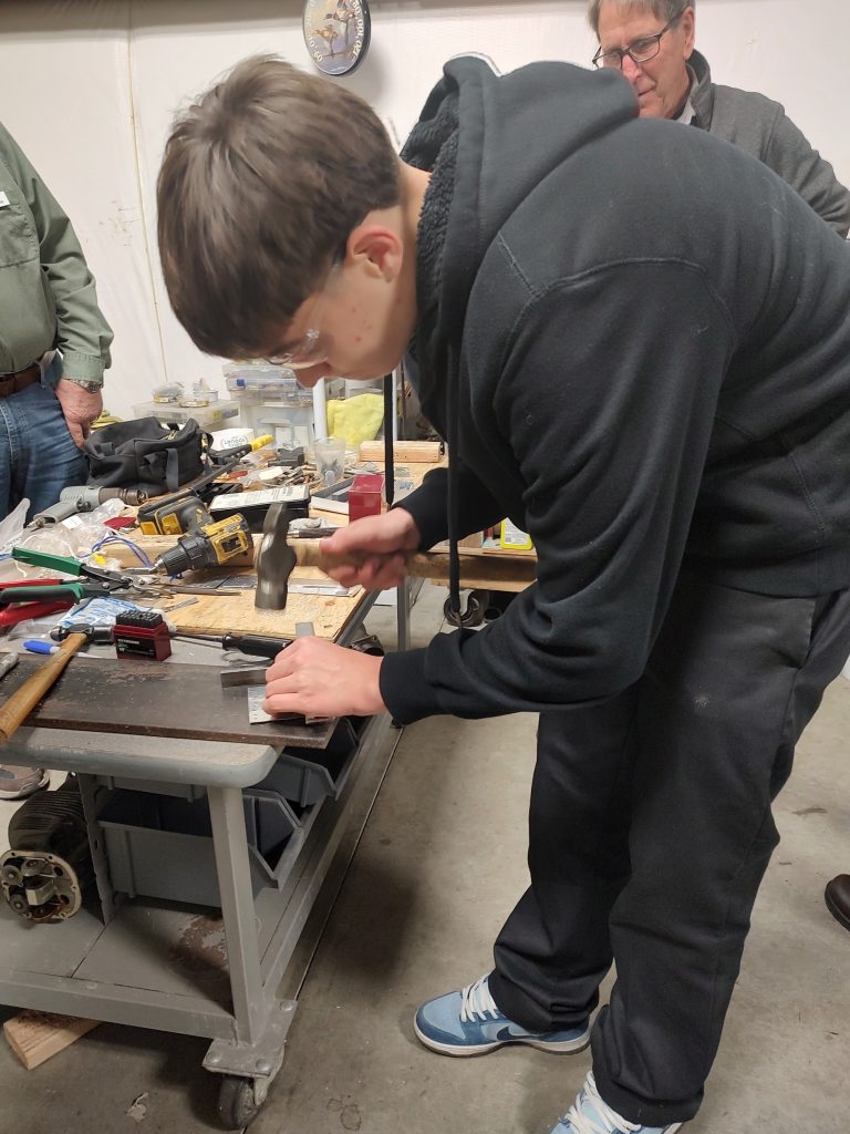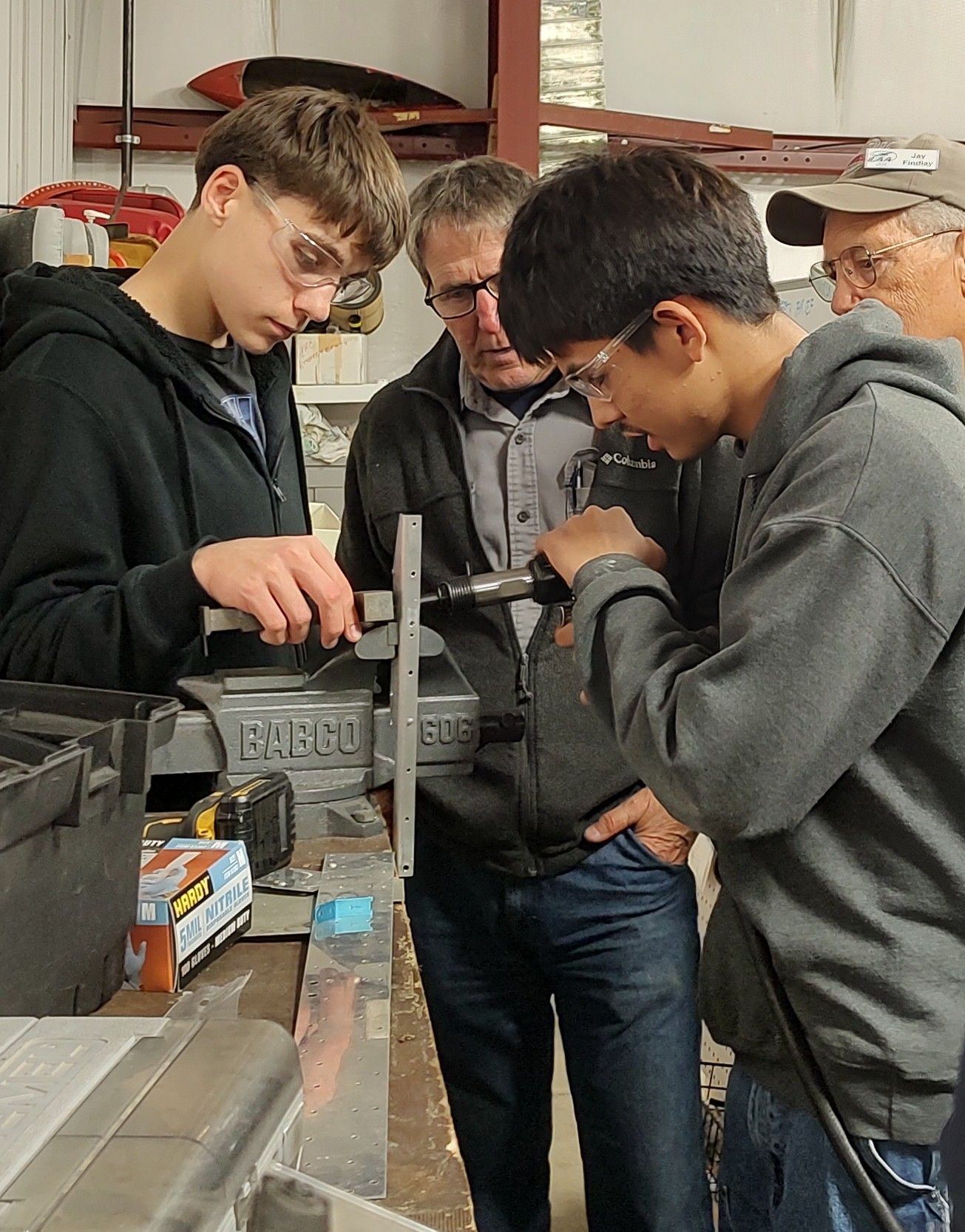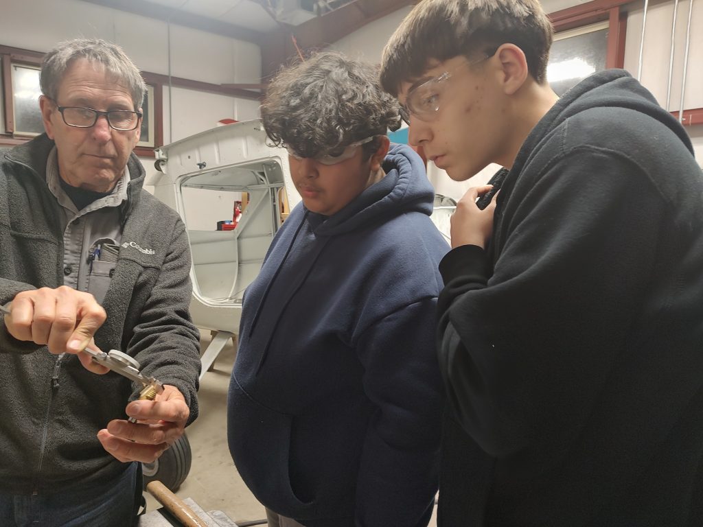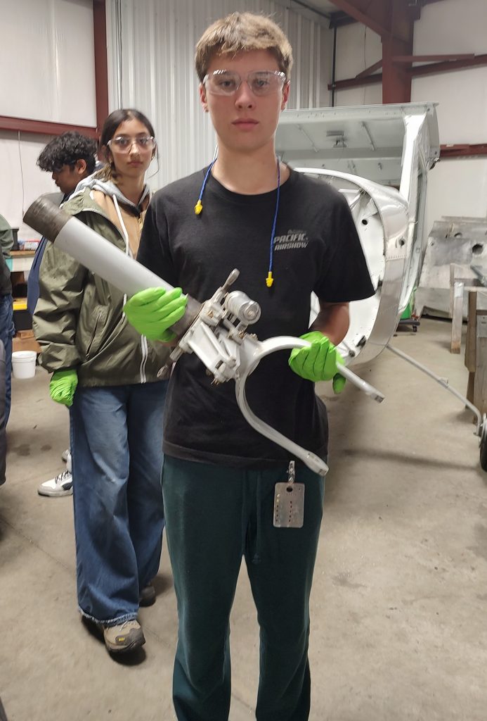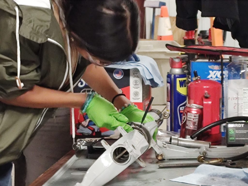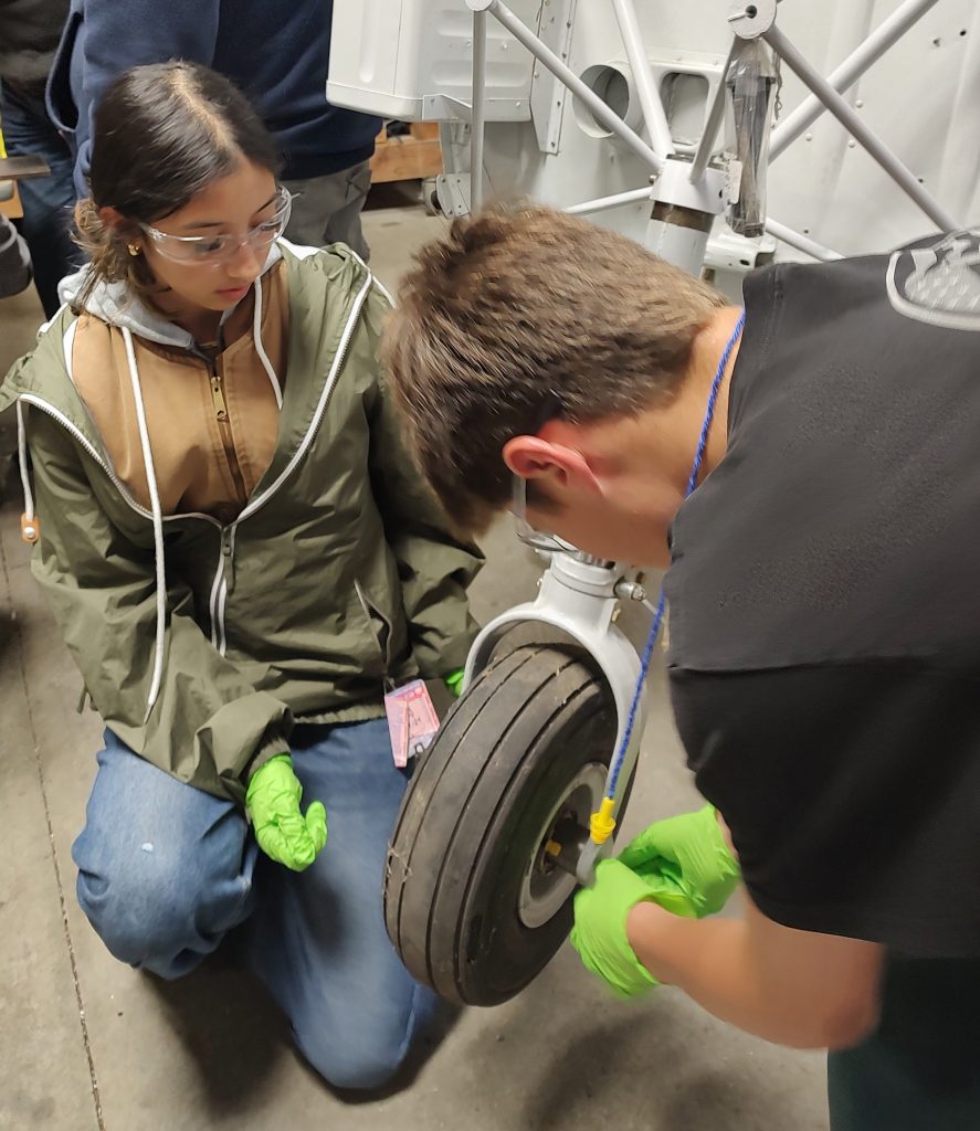 Another busy evening which included two new participants making their name badges. Nate and Abella were supported by the team from Vertex as they begin to rebuild the nose strut. They successfully removed the nose wheel to begin the process. Mentors continued to clean and inspect more parts.