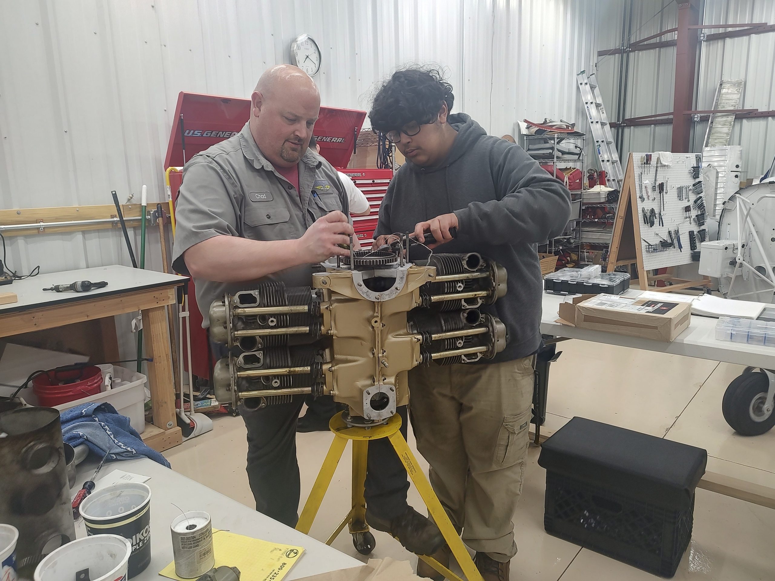 The team installed the safety wire. Foot pedal rigging was completed along with new cotter pins.