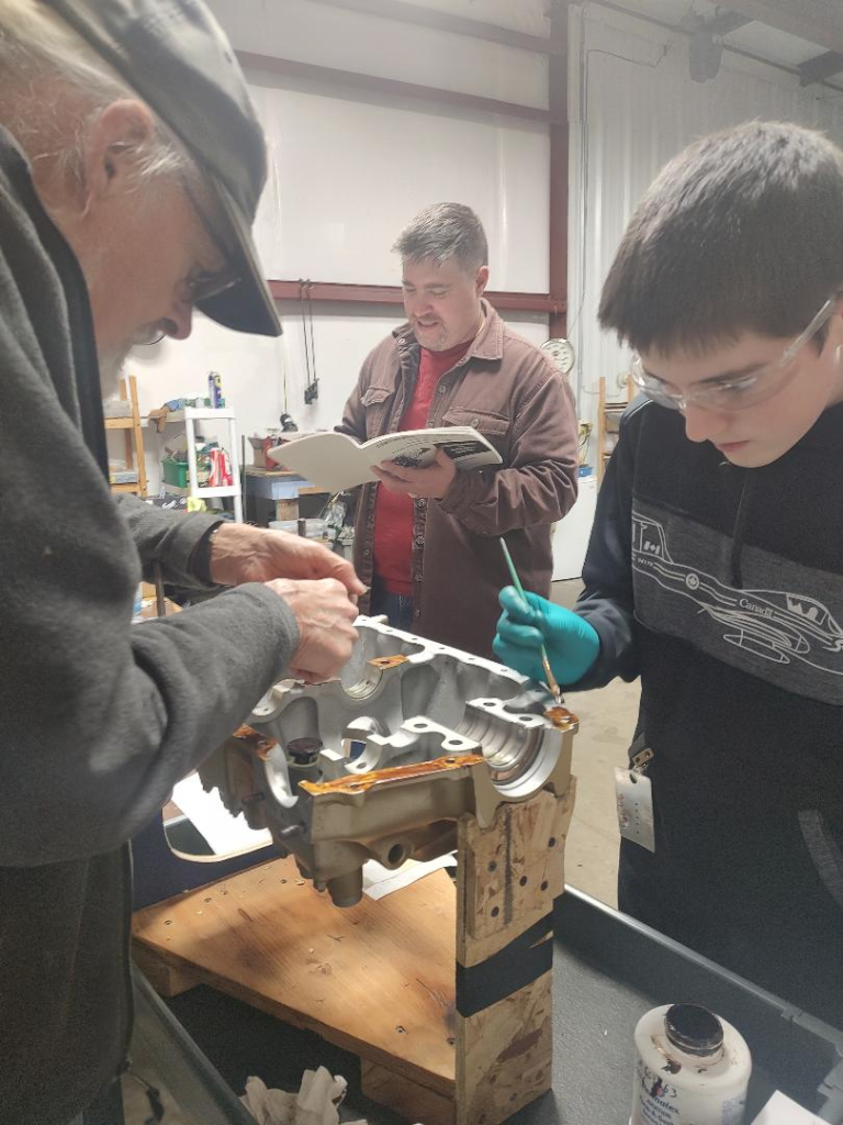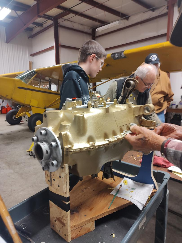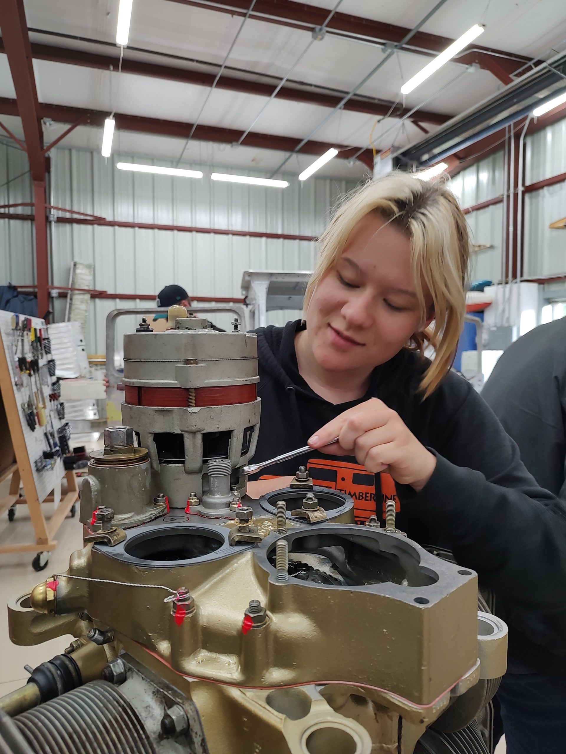 Hangar 400 has been buzzing with excitement. Zadok and Carter are working on a model design. Elijah has cleaned the parts for the motor mount shock bushings. Penny learned how to use the torque wrench while torquing the release valve. We have begun removing parts from one door to apply to another. A stripped stud was removed in preparation for the sump pump and the alternator was installed. Engine is ready to be mounted.