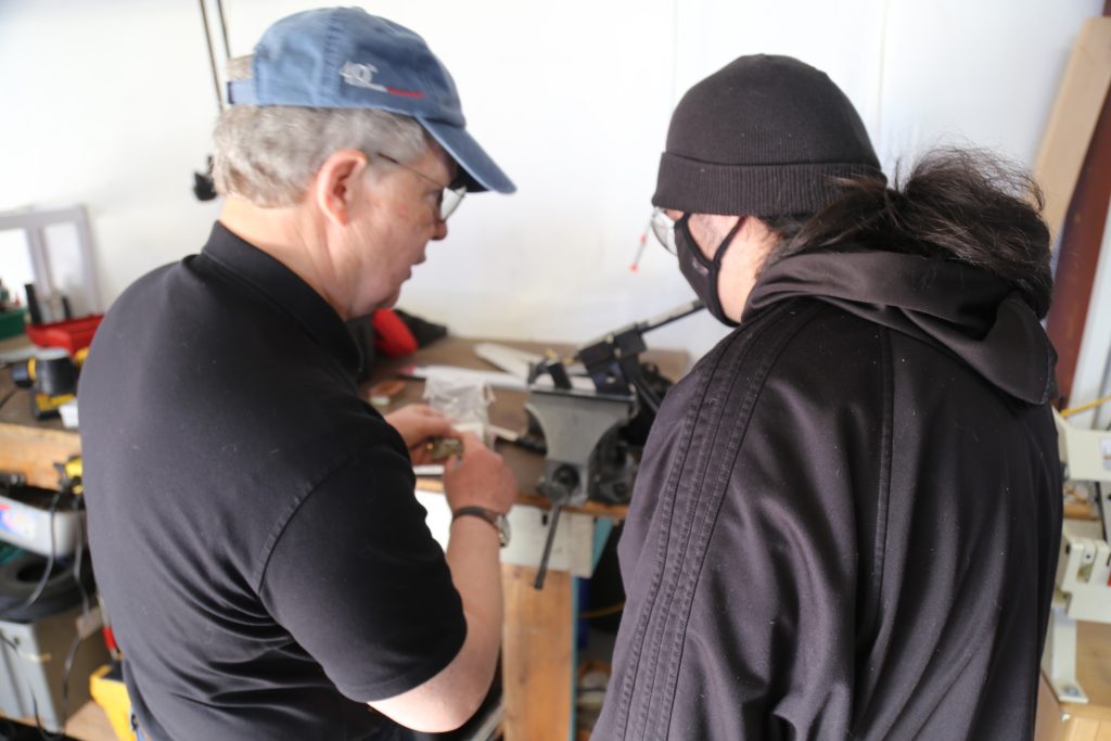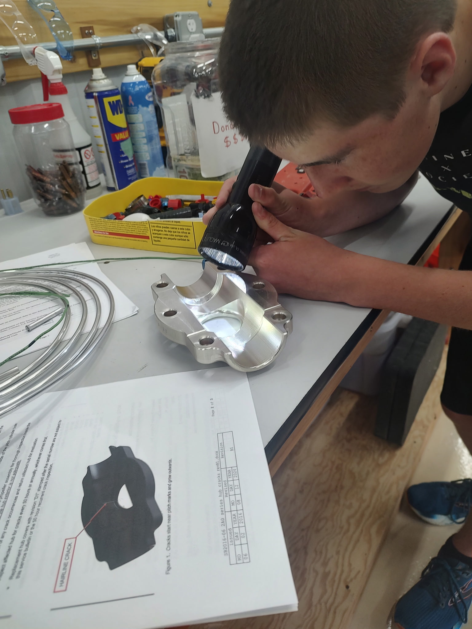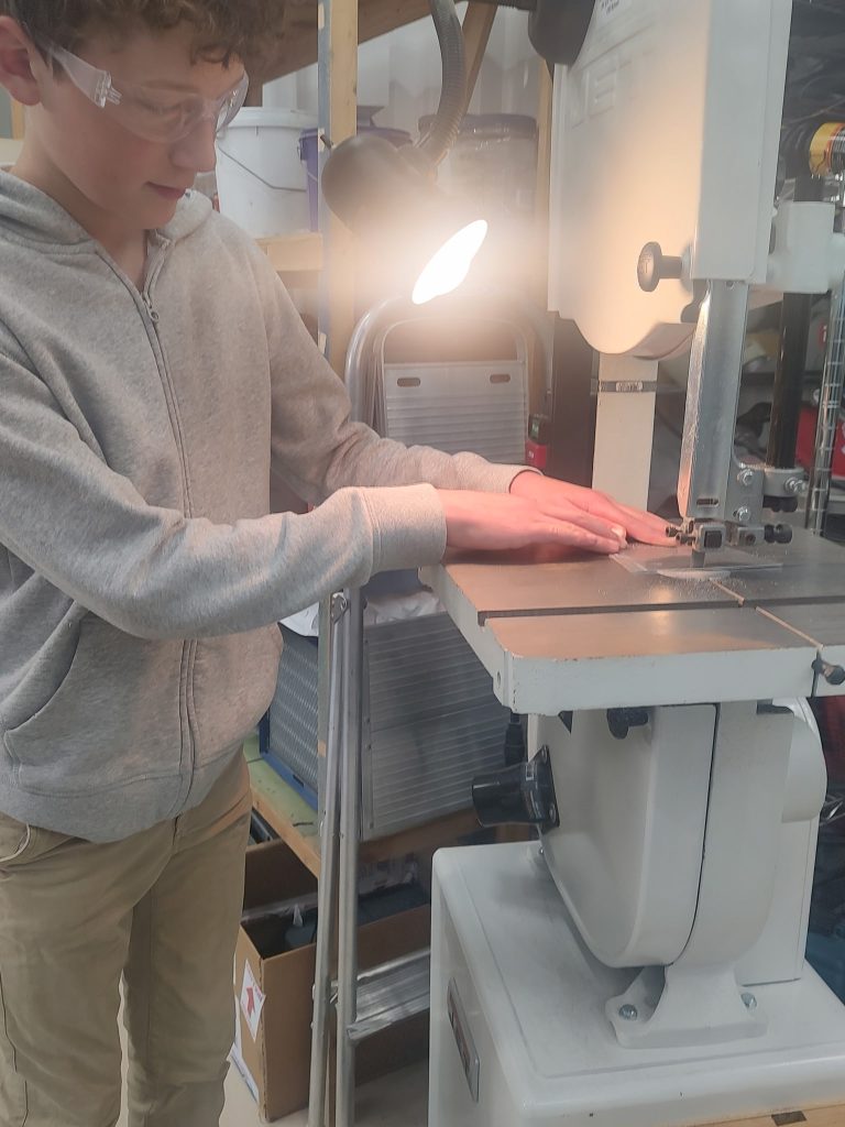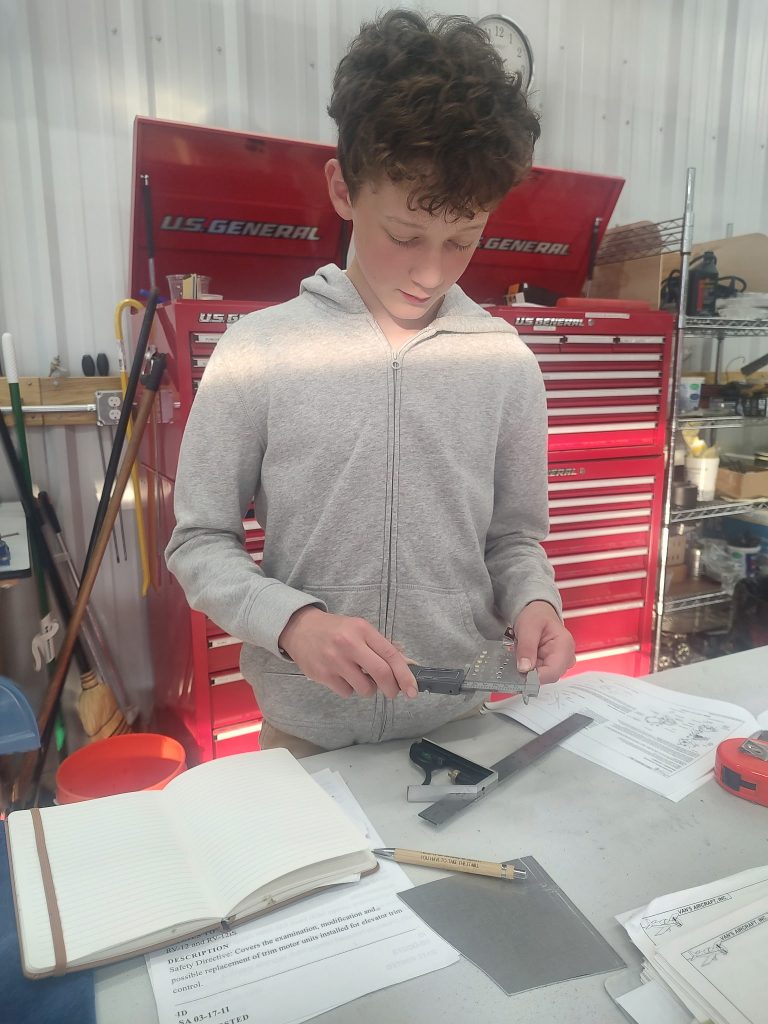 Our newest participant, Asher was busy making his badge and was instructed on the use of a few of the power tools in the process. Carter inspected the hub for cracks. The A.D.A.H.A.R.S. was previously installed upside down on the RV which needed to be corrected. The trim motor was removed to be inspected to see if it meets the requirements according to the Service Bulletin.